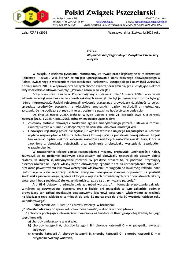 Od 18 marca 2026 w wchodzi w życie ustawa, która zmieni interesujące nas zapisy dotyczące pszczół. Zniesiony zostanie obowiązek zwalczania zgnilca amerykańskiego pszczół. Ustawa o zdrowiu zwierząt uchyla w sumie 122 Rozporządzenia Ministra Rolnictwa i Rozwoju Wsi. Pojawia się obowiązek rejestracji pasiek. Obowiązek ten jest teoretycznie nieistotny z punktu widzenia zrzeszonych pszczelarzy. Mają oni zarejestrowane pasieki i corocznie aktualizują ich stan starając się o dopłaty.